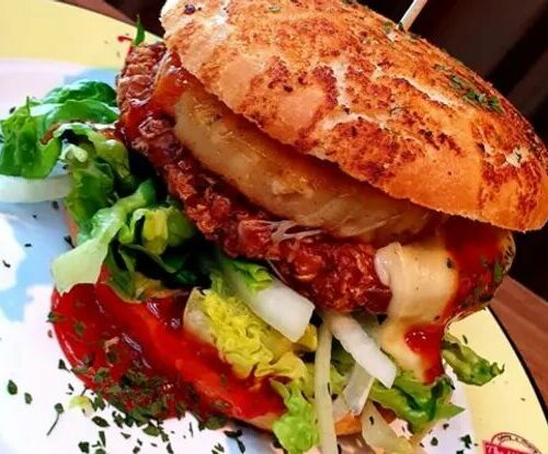 Dry Aged Beef Burger 200g feinstes Dry Aged Beef mit Zwiebelmayo, frittiertem Rösti, Feldsalat, würzigem Rinderschinken, Räucherkäse und Honey-BBQ-Sauce für nur 10,9o €…